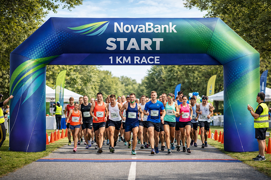 Brama reklamowa o wymiarach 4x3 m to mobilny i niezwykle skuteczny nośnik reklamy outdoorowej. Idealna jako meta lub start podczas biegów, rajdów i eventów sportowych. Wykonana z odpornego na warunki atmosferyczne poliestru, oferuje pełną personalizację dzięki nadrukowi sublimacyjnemu. W zestawie z kompletnym osprzętem – gotowa do pracy w kilka minut.