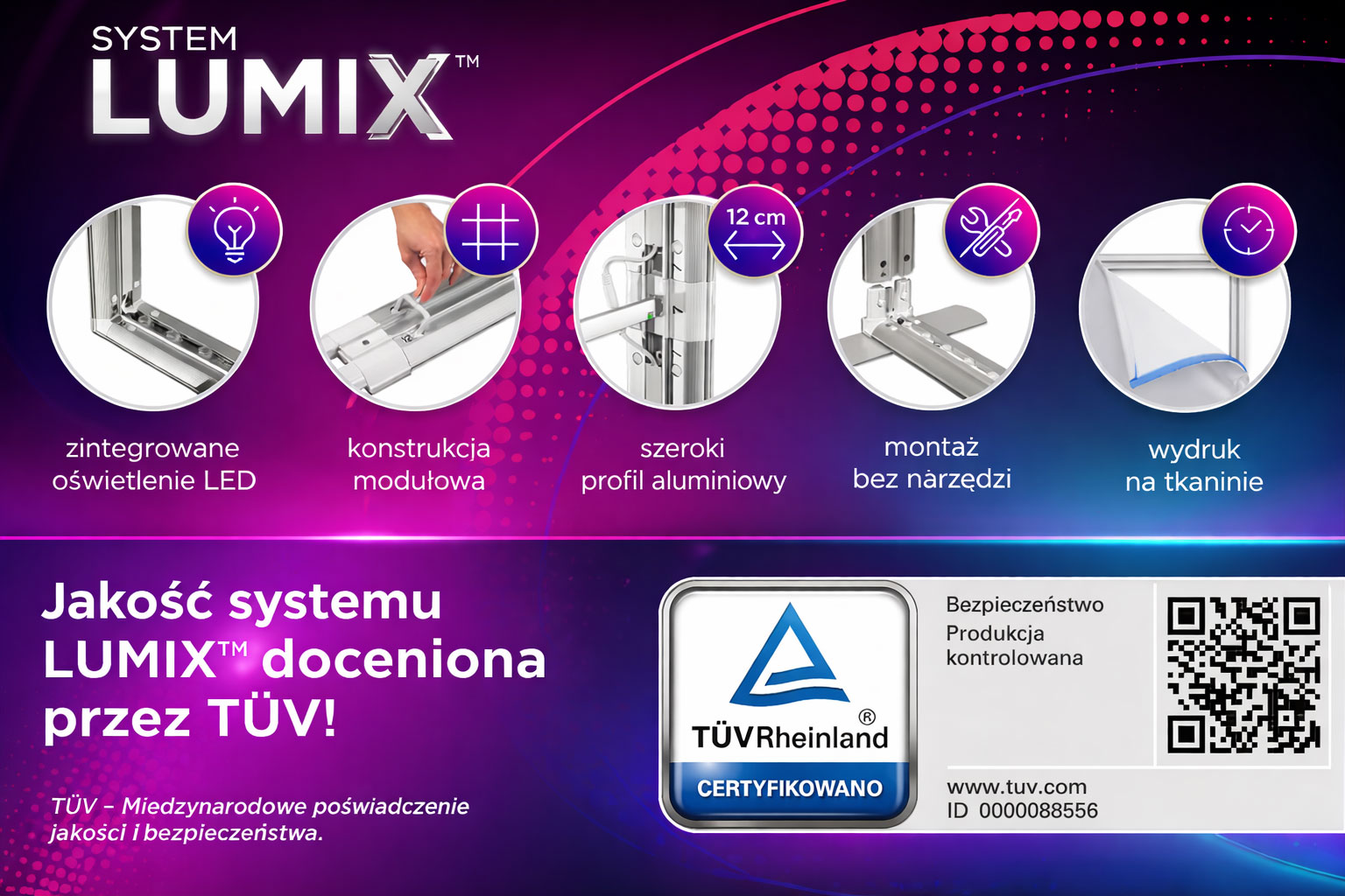 Stoisko targowe LUMIX™ 12 m² (4x3) półwysep to gotowa, podświetlana zabudowa LED z trybunką, która robi “efekt premium” na targach i eventach. Modułowa konstrukcja, montaż bez narzędzi i grafika na tkaninie SEG pozwalają szybko przygotować stoisko, które przyciąga uwagę nawet z dużej odległości.